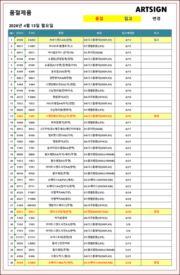 품절 / 입고 ] 2026년 4월 13일