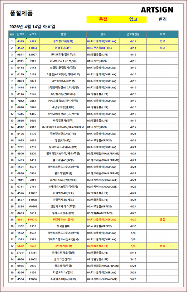 품절 / 입고 ] 2026년 4월 14일