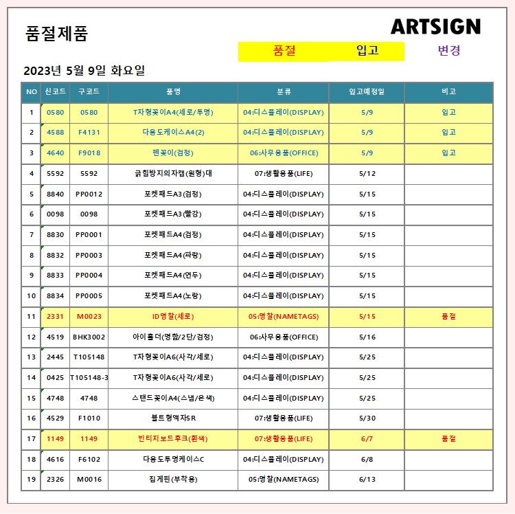 품절제품과 입고된 제품에 대해 안내드립니다.