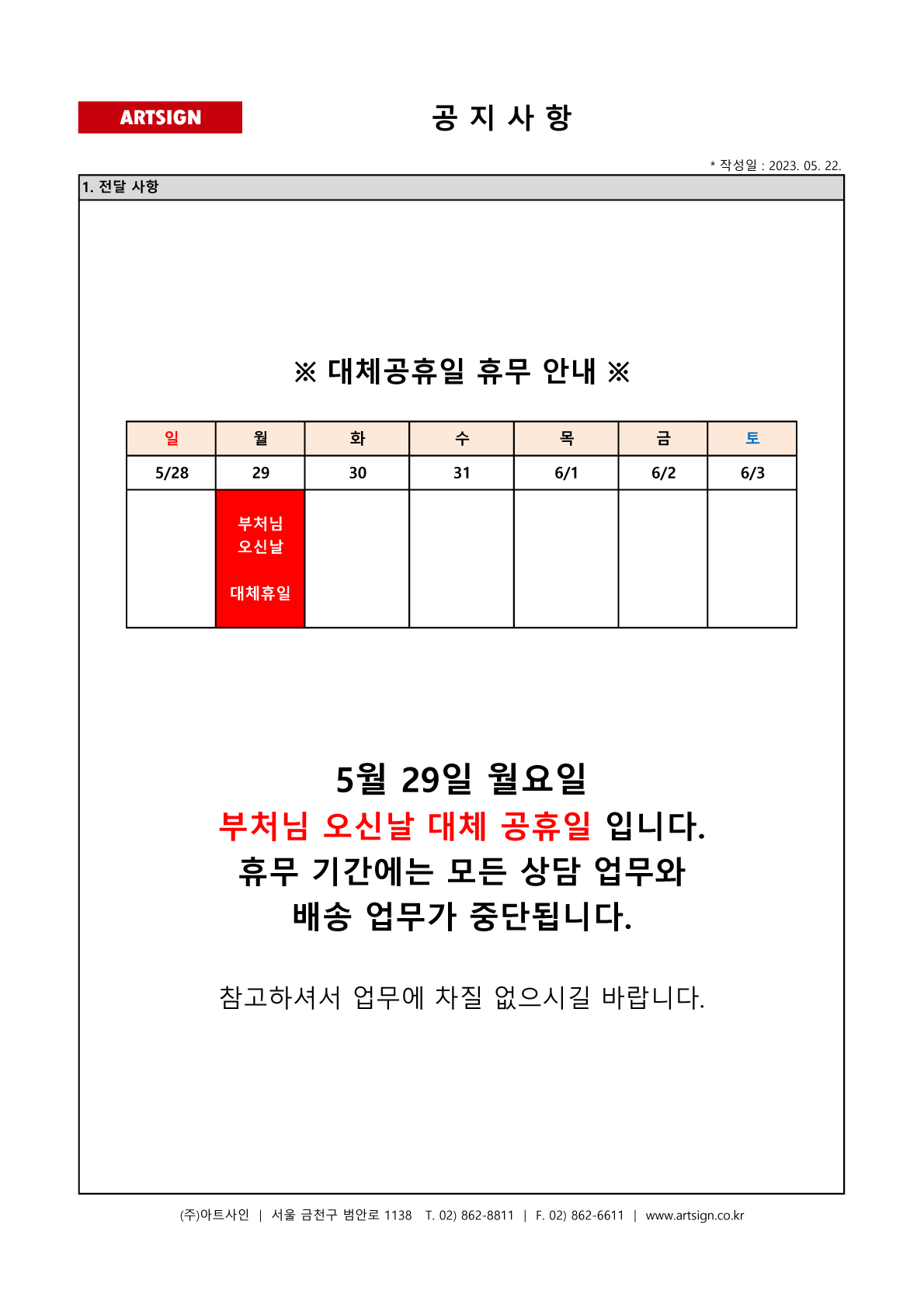 공지 ] 부처님오신날 대체공휴일 휴무 안내