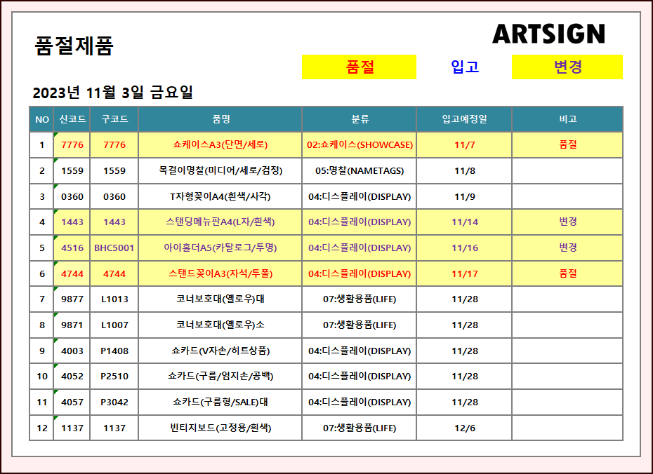 품절 / 변경 ] 2023년 11월 3일