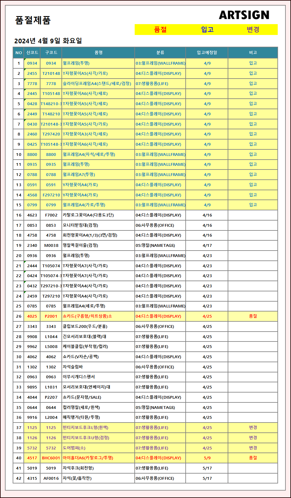 품절 / 입고 / 변경 ] 2024년 4월 9일