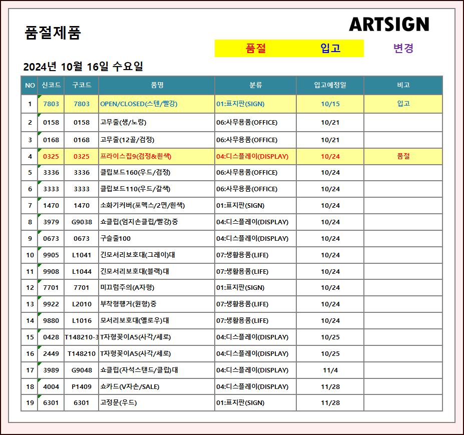 품절 제품과 입고 된 제품에 대해 안내 드립니다.
