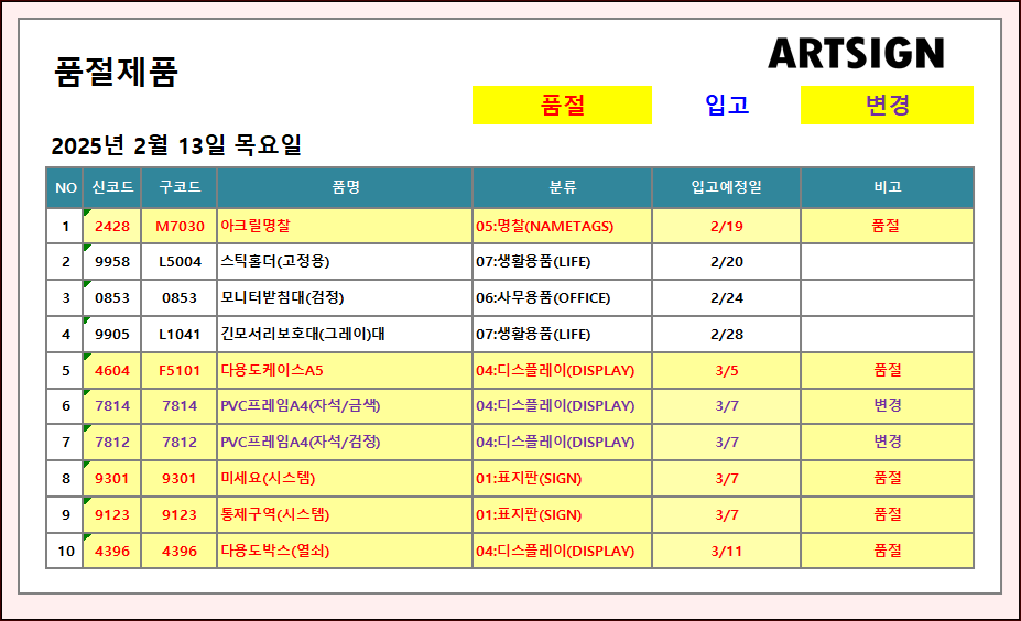 품절 제품과 입고일이 변경된 제품에 대해 안내 드립니다.