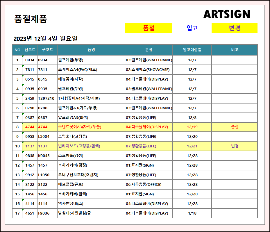 품절 제품과 입고일이 변경된 제품에 대해 안내 드립니다.