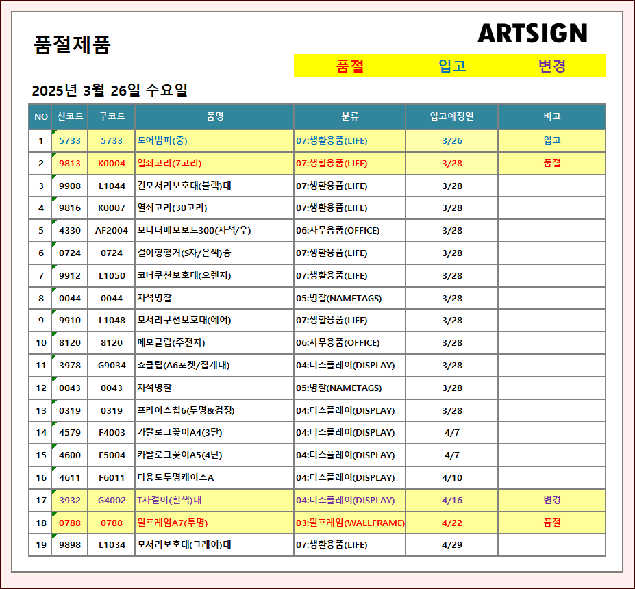 품절 / 입고 / 변경 ] 2025년 3월 26일