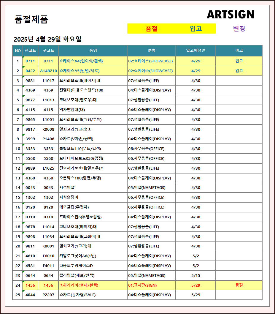 품절 제품과 입고된 제품에 대해 안내 드립니다.