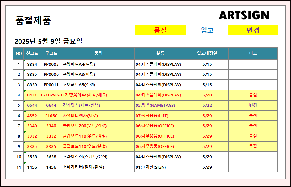 품절 제품과 입고일이 변경된 제품에 대해 안내 드립니다.