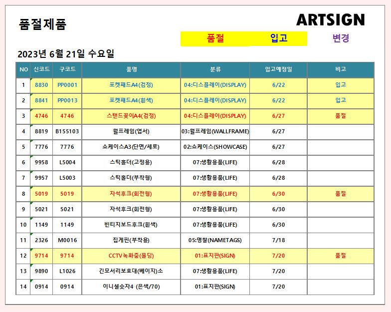 품절제품과 입고된 제품에 대해 안내드립니다.