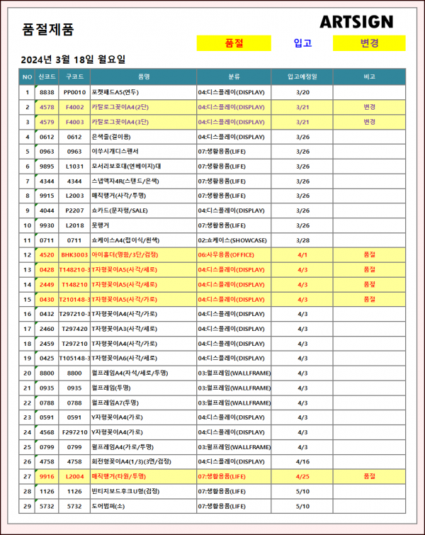 품절 제품과 입고일이 변경된 제품에 대해 안내 드립니다.