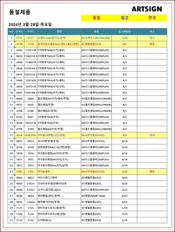 품절 / 입고 / 변경 ] 2024년 3월 28일