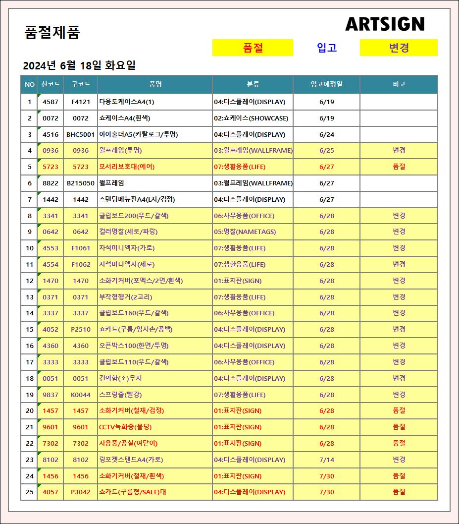품절 제품과 입고일이 변경된 제품에 대해 안내 드립니다.