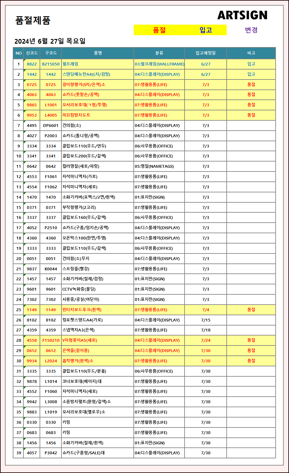 품절 / 입고 ] 2024년 6월 27일