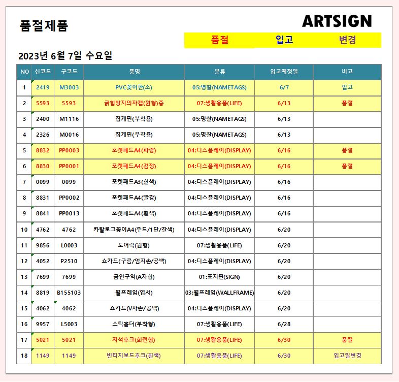 품절 / 입고 / 변경 ] 2023년 6월 7일