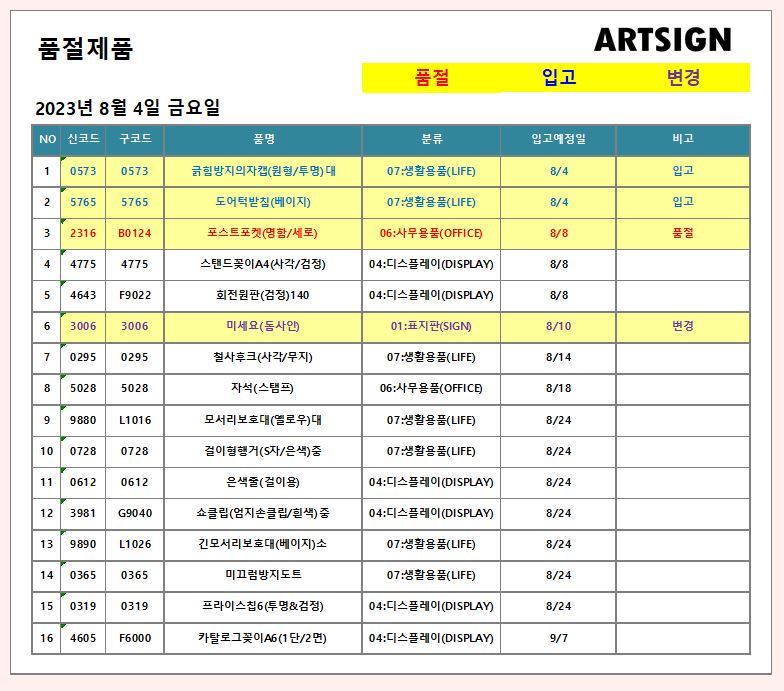 품절 / 입고 / 변경 ] 2023년 8월 4일