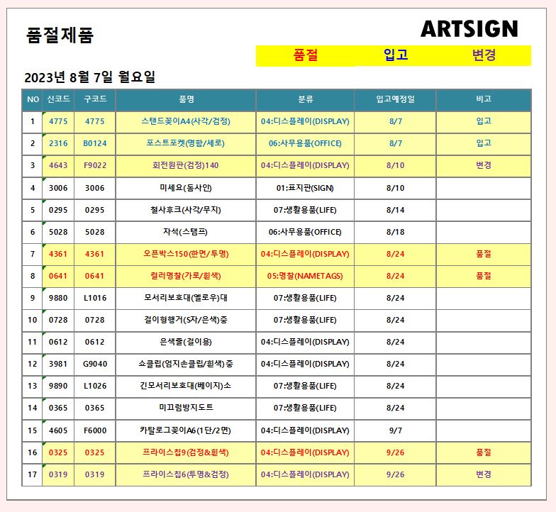 품절 / 입고 / 변경 ] 2023년 8월 7일