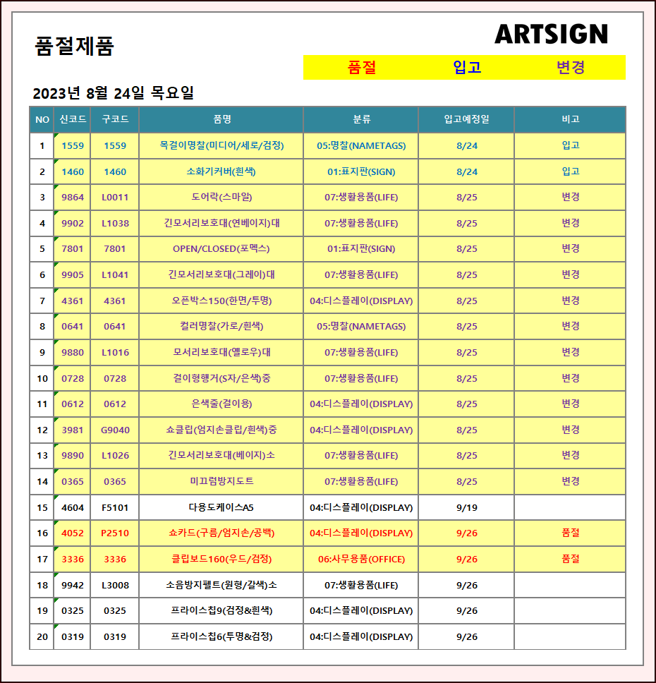 품절 / 입고 / 변경 ] 2023년 8월 24일