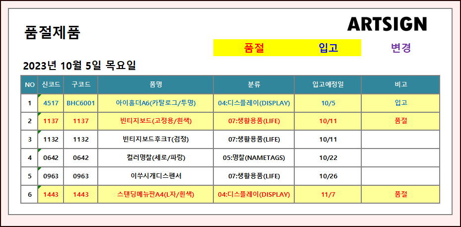 품절 / 입고 ] 2023년 10월 5일