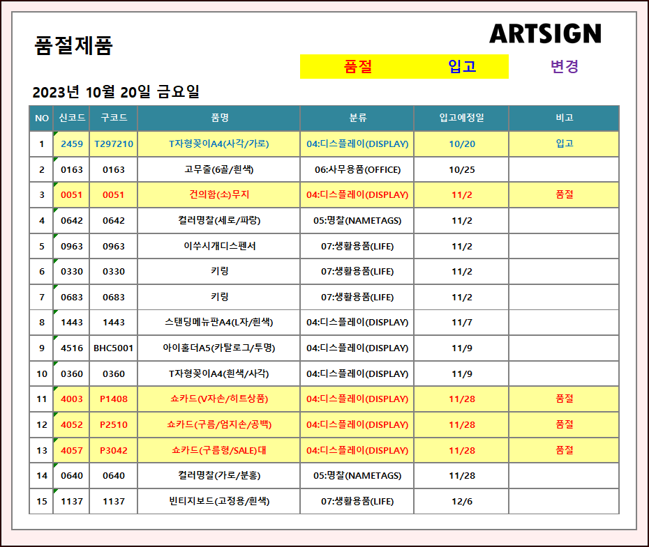 품절제품과 입고된 제품에 대해 안내드립니다.