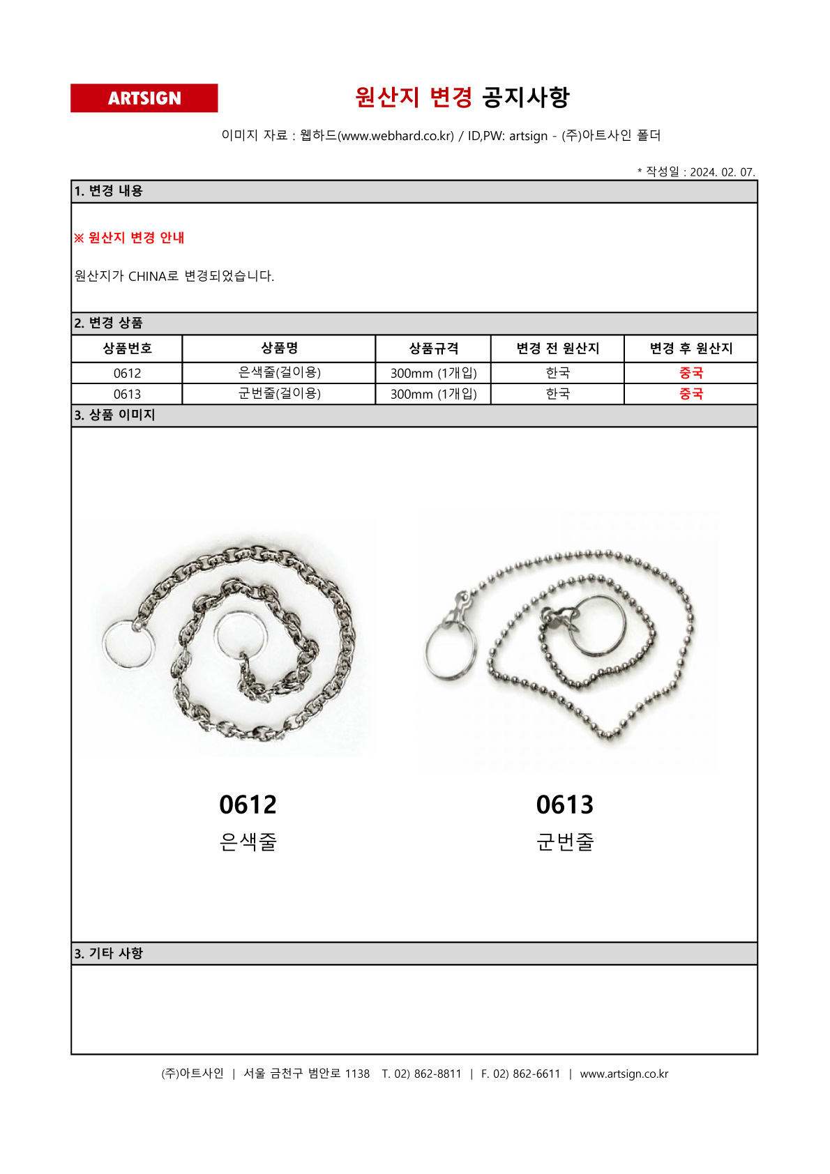 상품변경 ] 0612 은색줄, 0613 군번줄 원산지 변경