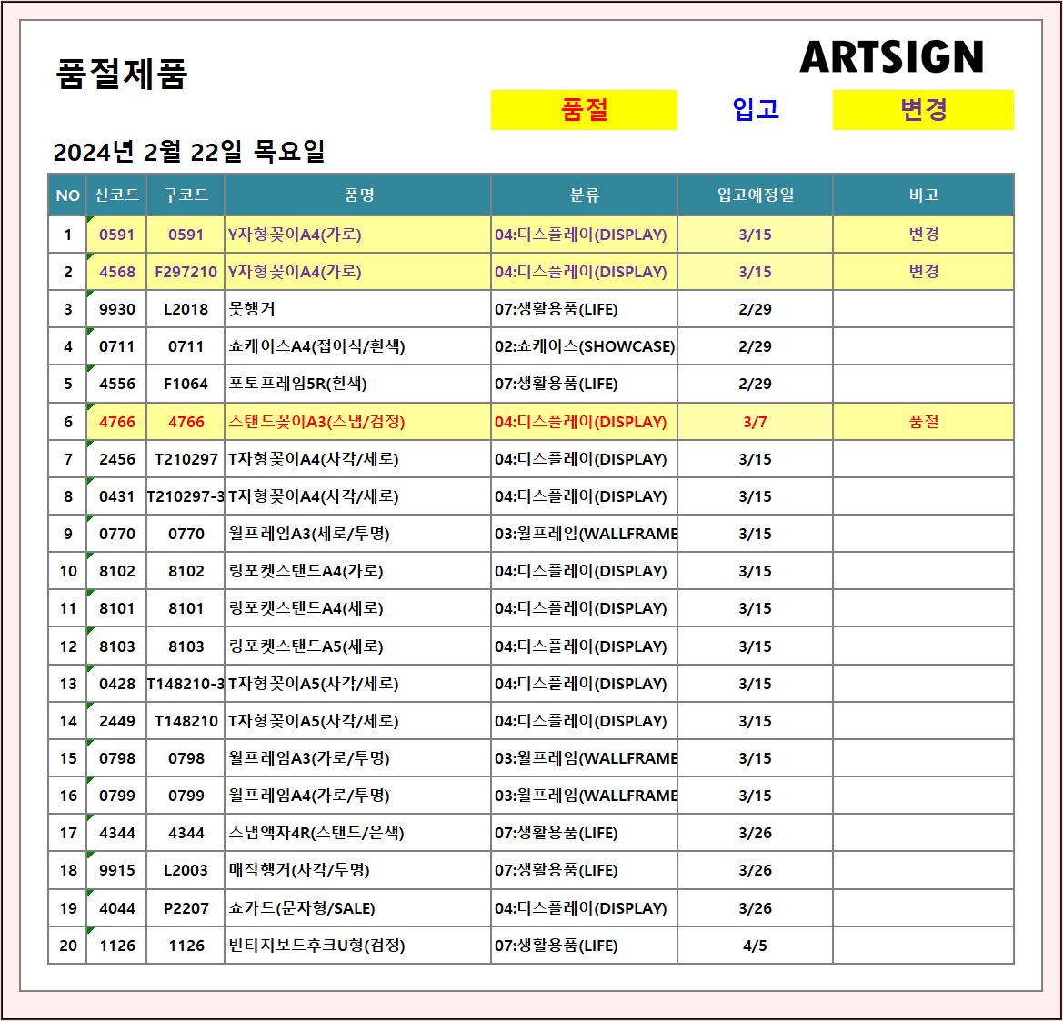 품절 제품과 입고일이 변경된 제품에 대해 안내 드립니다.