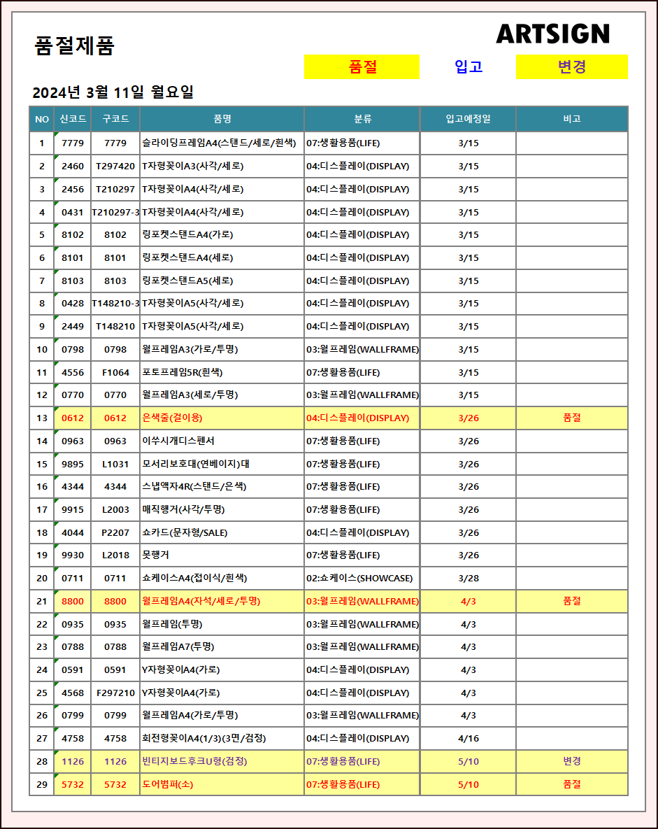 품절 제품과 입고일이 변경된 제품에 대해 안내 드립니다.