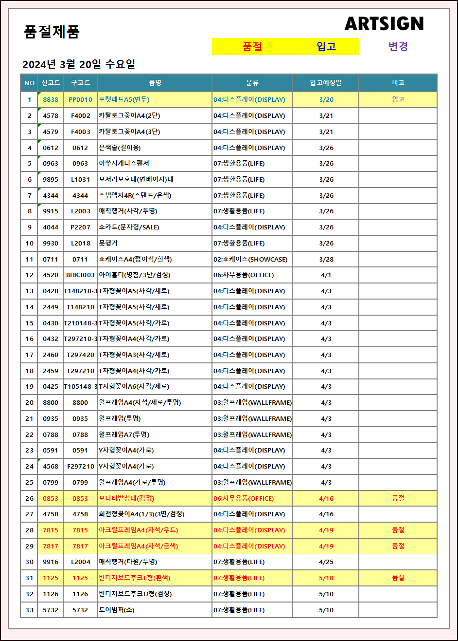품절 제품과 입고된 제품에 대해 안내 드립니다.