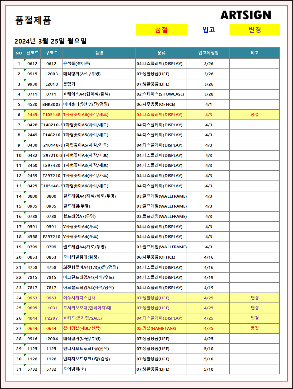 품절 제품과 입고일이 변경된 제품에 대해 안내드립니다.