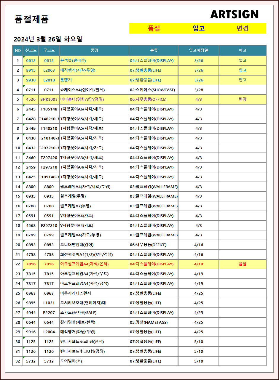 품절 / 입고 / 변경 ] 2024년 3월 26일