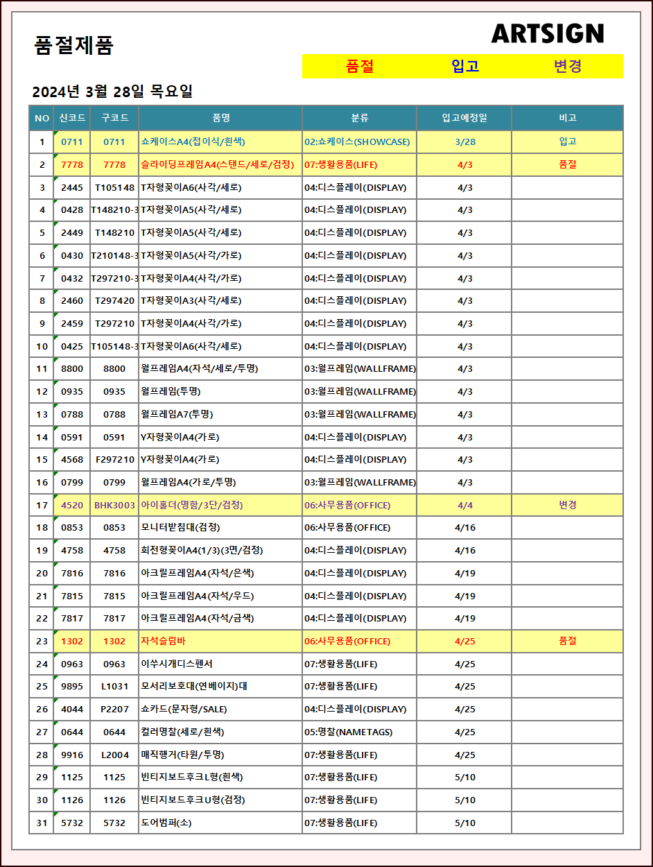 품절 / 입고 / 변경 ] 2024년 3월 28일