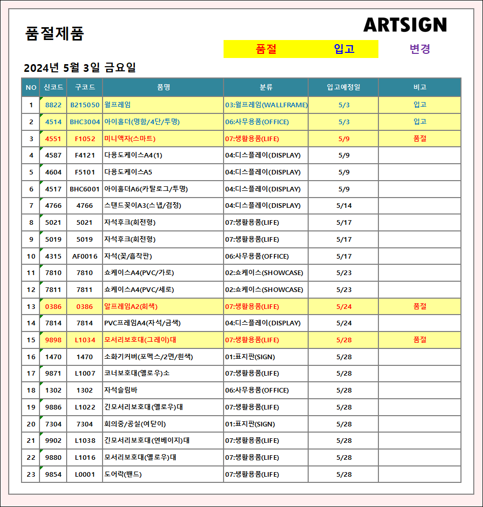 품절 제품과 입고된 제품에 대해 안내 드립니다.