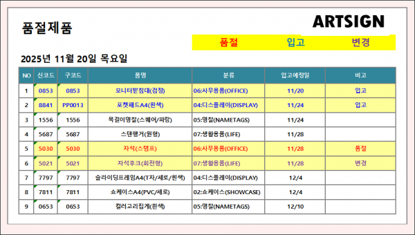 품절 / 입고 / 변경 ] 2025년 11월 20일