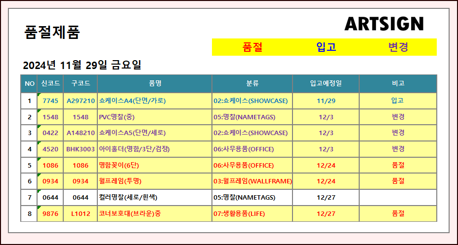 품절 / 입고 / 변경 ] 2024년 11월 29일