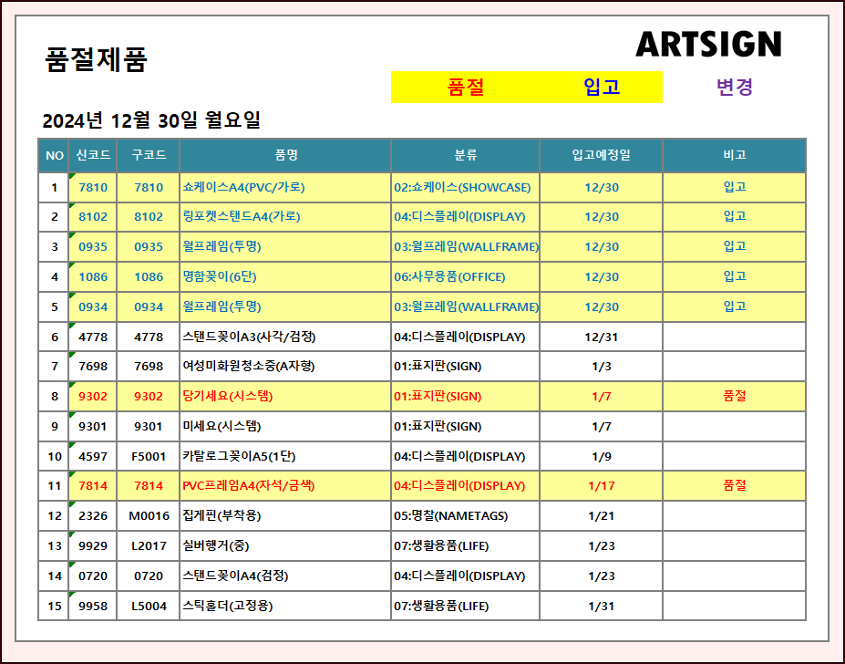 품절 제품과 입고된 제품에 대해 안내 드립니다.