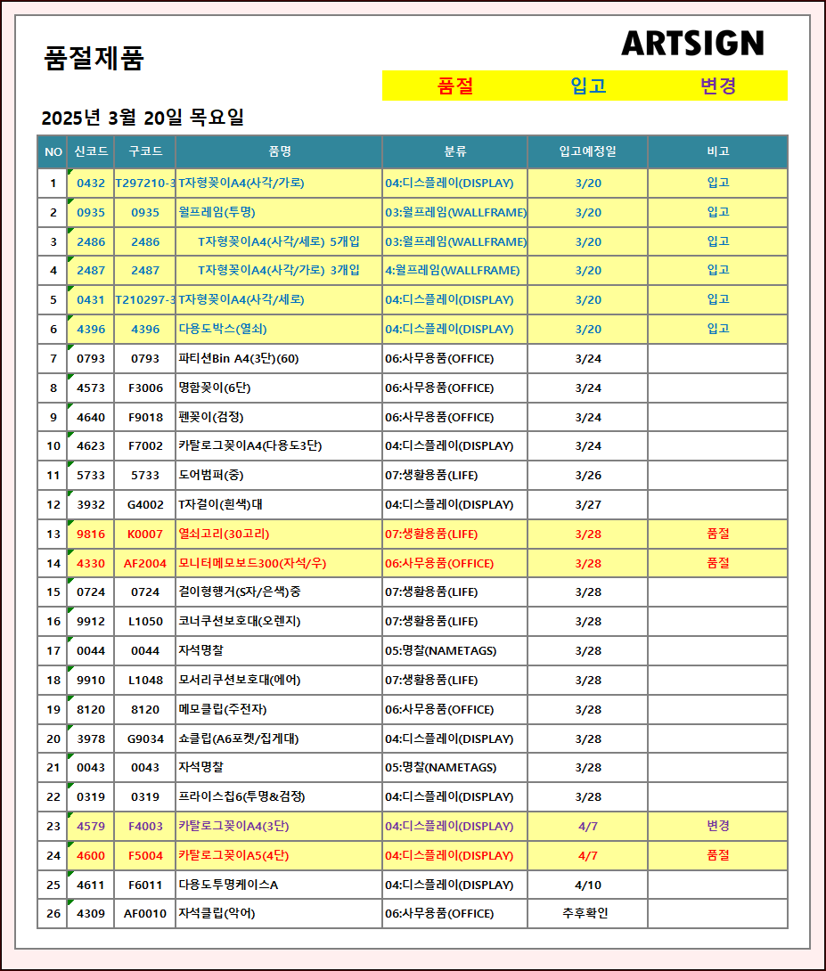 품절 / 입고 / 변경 ] 2025년 3월 20일