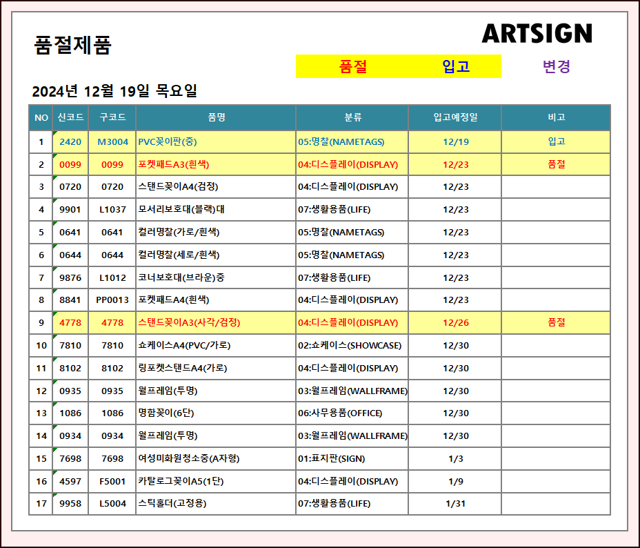 품절 제품과 입고 된 제품에 대해 안내 드립니다.