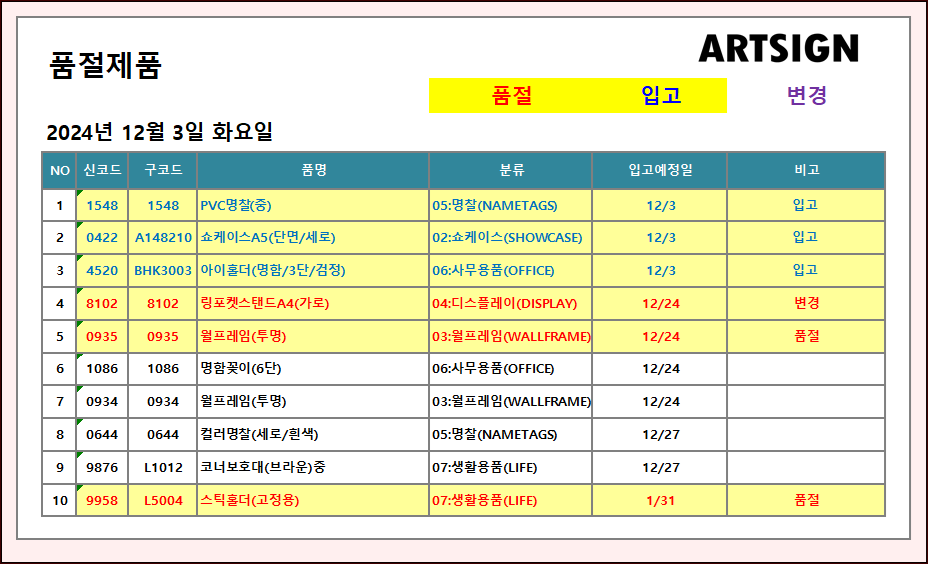 품절 제품과 입고 된 제품에 대해 안내 드립니다.