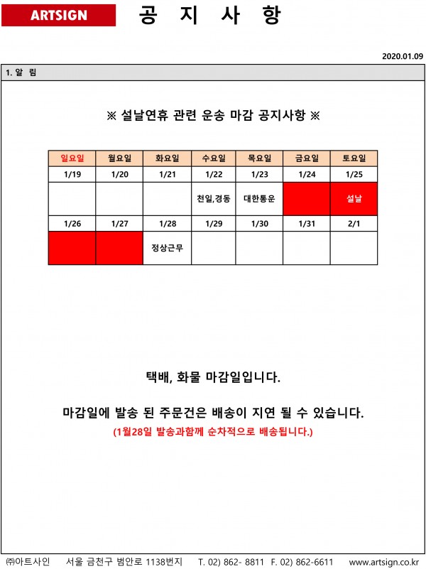 마감공지] 2020 설 연휴 운송 마감 공지입니다.
