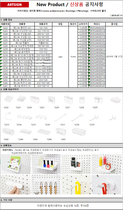 신제품 페그보선반, 수납함, 후크가 출시되었습니다.