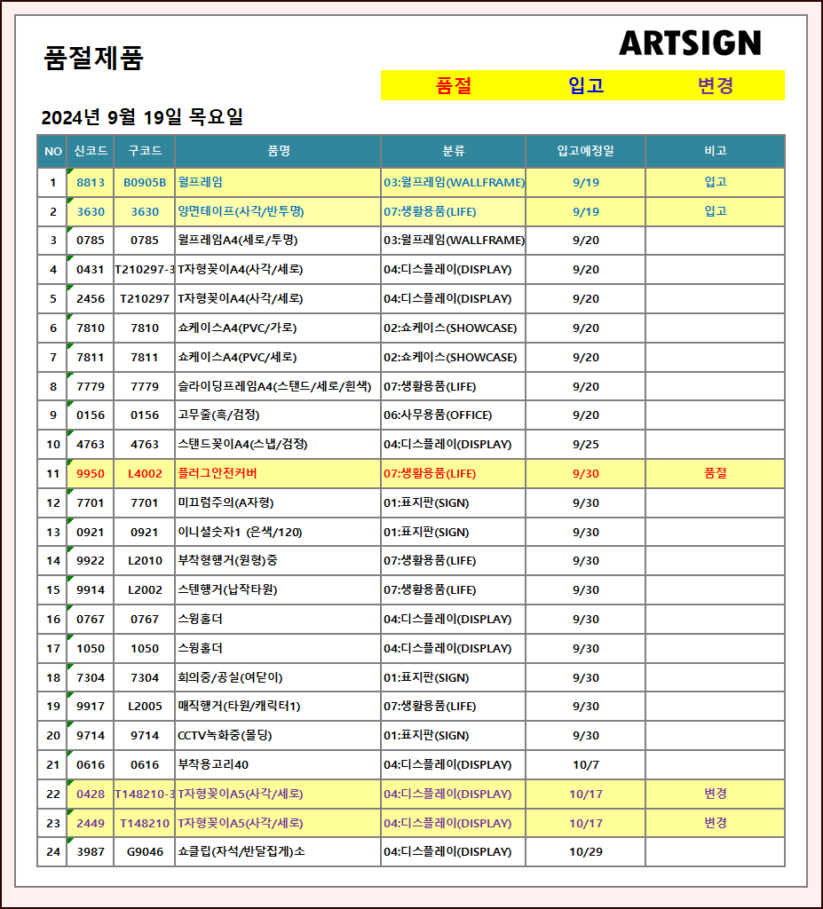 품절 / 입고 / 변경 ] 2024년 9월 19일
