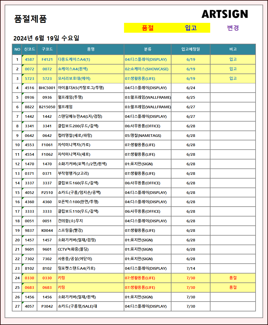 품절 제품과 입고 된 제품에 대해 안내 드립니다.
