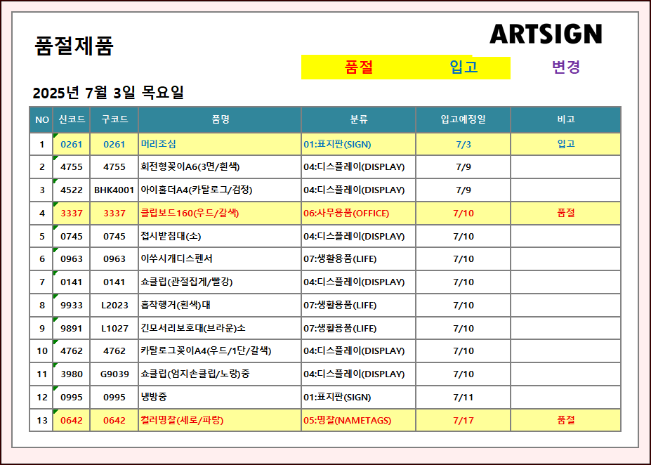 품절 제품과 입고된 제품에 대해 안내 드립니다.