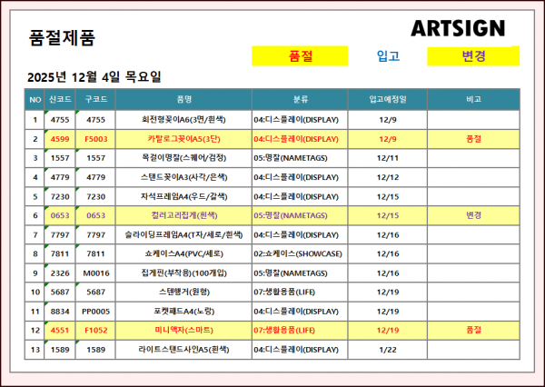 품절 제품과 입고일이 변경된 제품에 대해 안내 드립니다.