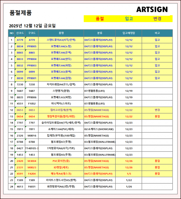 품절 / 입고 / 변경 ] 2025년 12월 12일