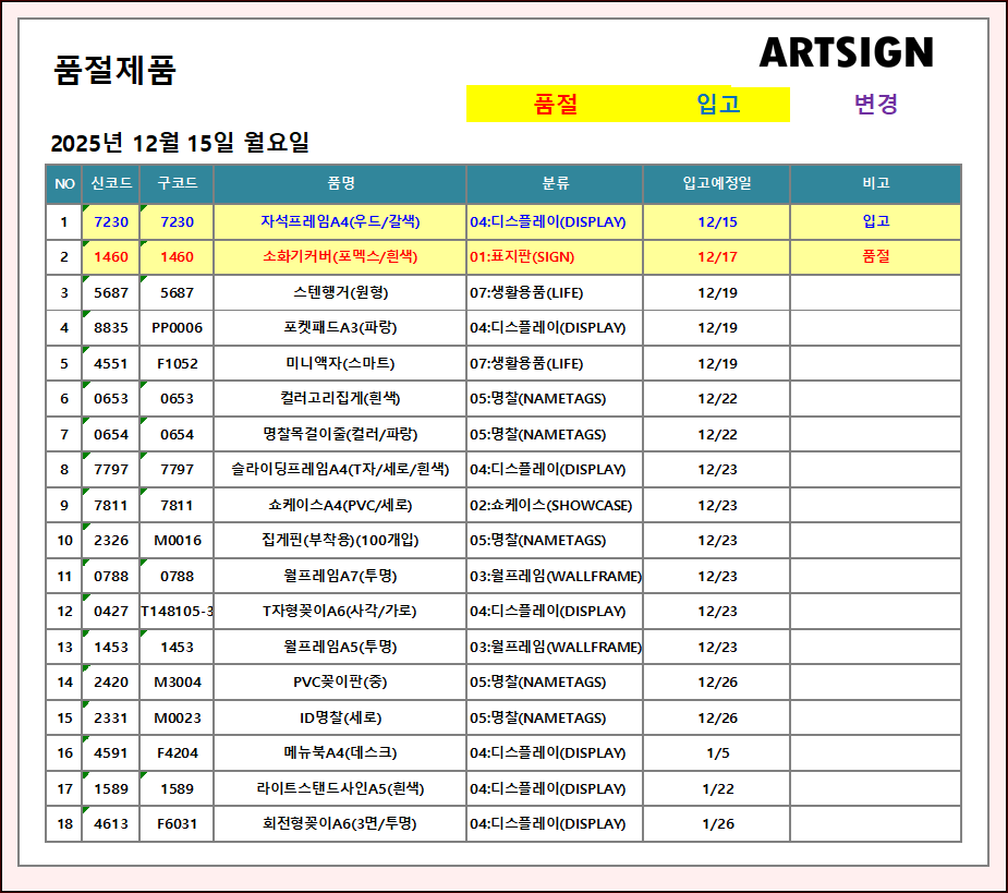 품절 제품과 입고된 제품에 대해 안내 드립니다.