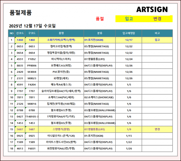입고된 제품과 입고일이 변경된 제품에 대해 안내 드립니다.