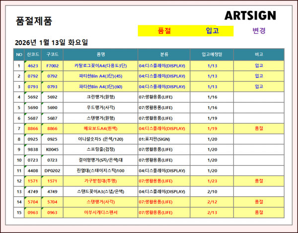 품절 / 입고 ] 2026년 1월 13일