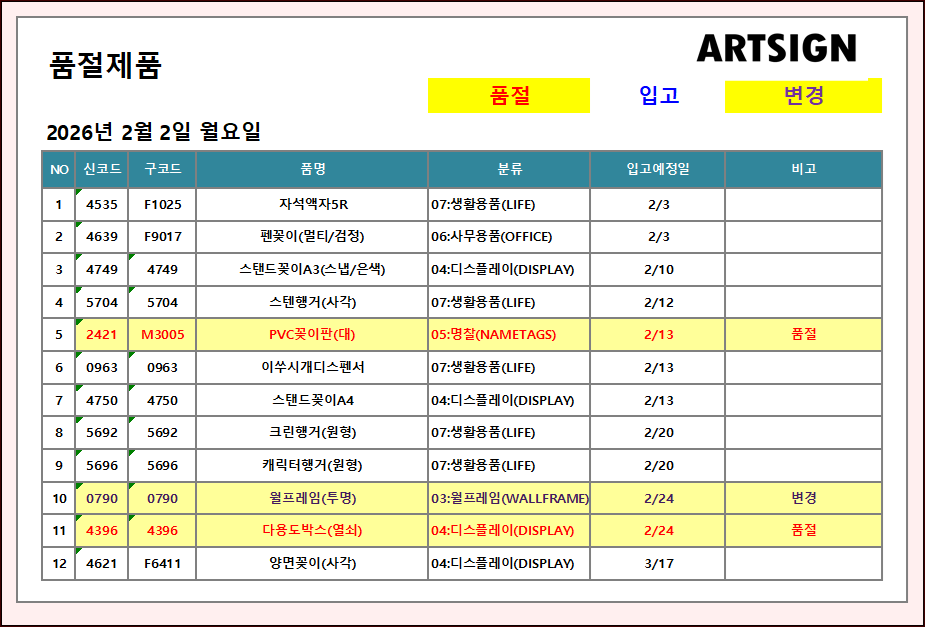 품절 / 변경 ] 2026년 2월 2일