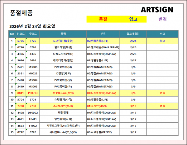 품절 제품과 입고 된 제품에 대해 안내 드립니다.