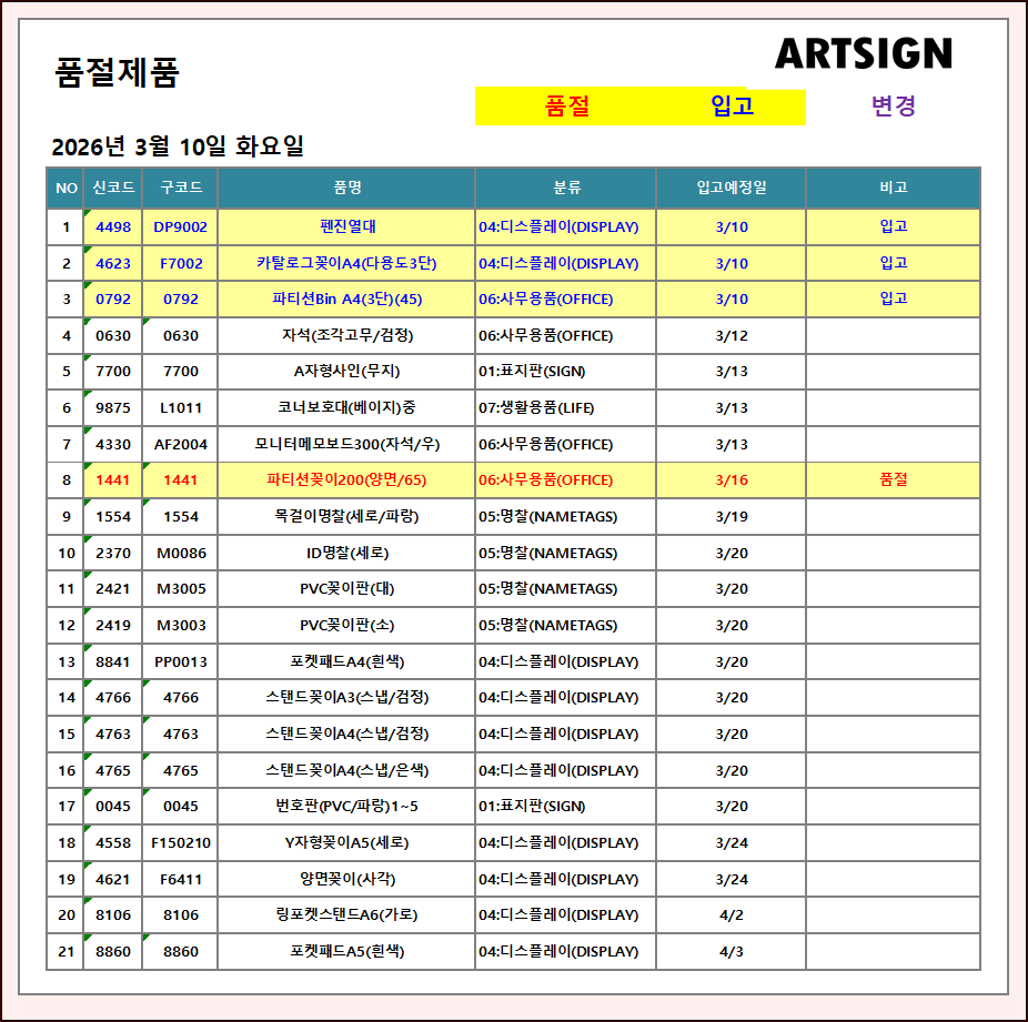 품절 제품과 입고된 제품에 대해 안내드립니다.